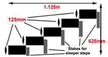 When you are using wooden stakes, they have to be at least 300mm long. You will have to dig enough space to accommodate the sleepers and the wooden stakes behind. Place the wooden stakes on both sides to support the sleepers and make certain that they are levelled. The top of the stakes should be about a centimetre below the sleeper. If necessary and especially if the steps deep, fill the space behind with barks, shingle, or chippings and compact. Repeat for each steps gradually.